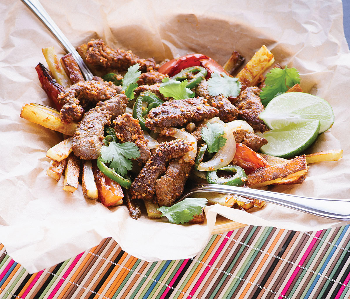 To serve, place the fries on a plate, top with meat and veggies, then sprinkle with cilantro and a squeeze of lime juice.