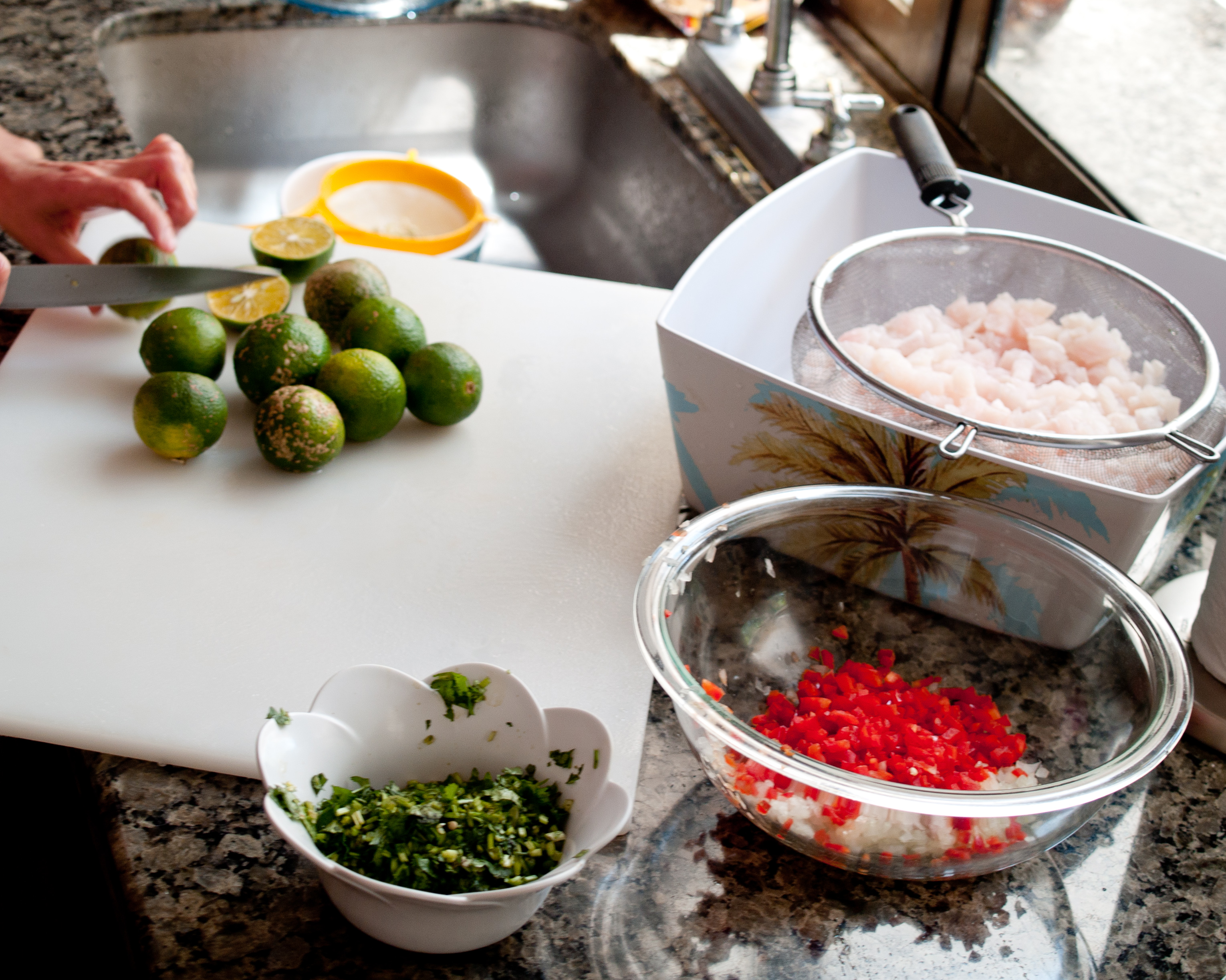 Prep the ceviche. Combine all the ingredients in a large glass bowl, cover tightly with plastic wrap, and allow the fish to ‘cook’ in the marinade for at least 30 minutes. It tastes best after 6-8 hours and is phenomenally good on the second day.